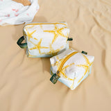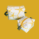 Pamuklu kırık beyaz kanvas üzeri denizyıldızı deseni baskılı yumuşak çantalardır. 2 boydur. Kozmetik çanta olarak yada seyahatlerde bavul içinde yada her türlü aksesuarınızı saklamak amaçlı kullanabilirsiniz.