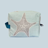Pamuklu kanvas üzeri turkuaz denizyıldızı deseni baskılı yumuşak çantalardır. Büyük boydur. Kozmetik çanta olarak yada seyahatlerde bavul içinde yada her türlü aksesuarınızı saklamak amaçlı kullanabilirsiniz.