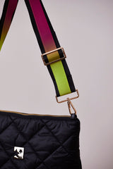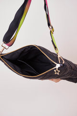 Büyükboy, hafif ve su geçirmeyen bu çantamız hem omuzda hemde çapraz kullanılıyor. Askıları 5cm balıksırtı desenli siyah renk kolon üzeri pembe degrade fransız şerit aksesuarlıdır. Altın metal fermuarlıdır.
