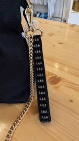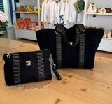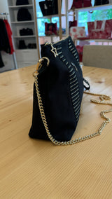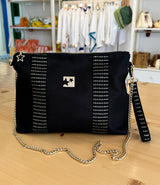 Siyah kanvas kumaş üzerine Altın piramit desenli Fransız Aksesuarlı çok şık bir çantadır. Tabanı 10 cm genişliğindedir.