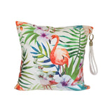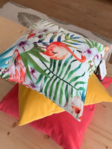 Renkli tropikal bir dekorasyon için bu yastığı seçebilirsiniz. Kadife kumaştır. Yastık yanlarında altın kanca içinde yeşil örgü ip aksesuar vardır.