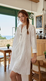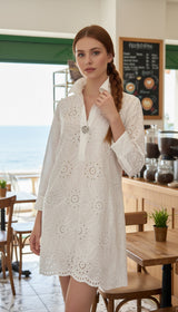 İnce pamuklu çiçek desen nakışlı fisto kumaştan, truvakar kol, bol kesim, rahat bir elbisedir. Göğüs ve manşetlerde gümüş çiçekli düğmeleri vardır. İçinde pamuklu kumaştan astar etek vardır.
