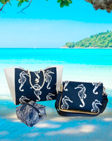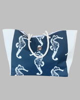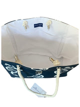 Lacivert beyaz denizatı deseni, pırıltılı lacivert fransız şerit aksesuarlarıyla çok şık bir çantadır. Plajda ve şehir içinde kullanılabilir. Hafiftir, taşıması rahattır. İçi geniştir.